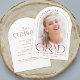 Esta profunda tarjeta de graduación minimalista, roja y blanca, sirve como una invitación de graduación y como una invitación para una fiesta de graduación, y cuenta con una foto, un arco y una elegante tipografía moderna.