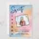 Invitación a la fiesta de cumpleaños de bonito y muchacha dulce de 16 años con un colorido fondo holográfico falso y elegante fuente caligráfica. Sube tu foto favorita.