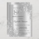 Una invitación moderna, de moda y glamurosa, con goteos purpurinas sobre un fondo plateado.