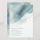 Una plantilla de invitación a bodas con temática playera que presenta una escena acuarela abstracta pintada de una playa y olas con efecto de tinta dorada (el oro es un efecto digital, ¡no un Relieve metalizado real!) y tipografía moderna en verde azulado. Elegante y elegante, sencillo y moderno, es una opción agradable para una boda playera en cualquier temporada, para una pareja moderna.