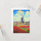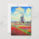 Tarjeta con la pintura de Claude Monet sobre la flor y el molino de viento. Hermosos y coloridos campos de tulipanes rojos, rosados y amarillos junto a un molino de viento y casa en Holanda. Un gran regalo de Monet para los amantes del impresionismo y el arte francés.