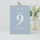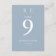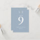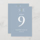 Estos números de tabla modernos y polvorientos de boda azul y oro de moda se pueden personalizar con sus iniciales de monograma, nombres y fecha especial. Diseñado por Thisisnotme©