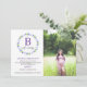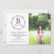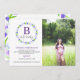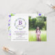 Una "B" grande, monogramada y morada se sienta dentro de una corona floral de color suave para nuestra B es para invitaciones fotográficas de Baby Baby Shower.