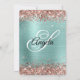 Una glamorosa monogramada de 21 años, esquina redondeada vertical 5x7, invitación para ella. Purpurina de oro rosa brillante falso con chispas contra una falsa imagen gráfica de Relieve metalizado turquesa pálido pálido metalizado cepillado. El lujoso monograma de caligrafía en blanco y negro en el reverso puede ser personalizado o borrado. Todos los elementos brillantes y brillantes de este moderno diseño giratorio son gráficos digitales.