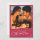 Una invitación de compromiso minimalista elegante con caligrafía manuscrita, nombres personalizados y monograma en color Viva Magenta