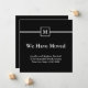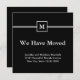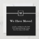Esta invitación móvil se puede personalizar con su monograma, nombre y nueva dirección. En la parte superior hay un cuadrado para tu monograma. El texto es blanco. El fondo es negro.