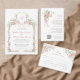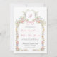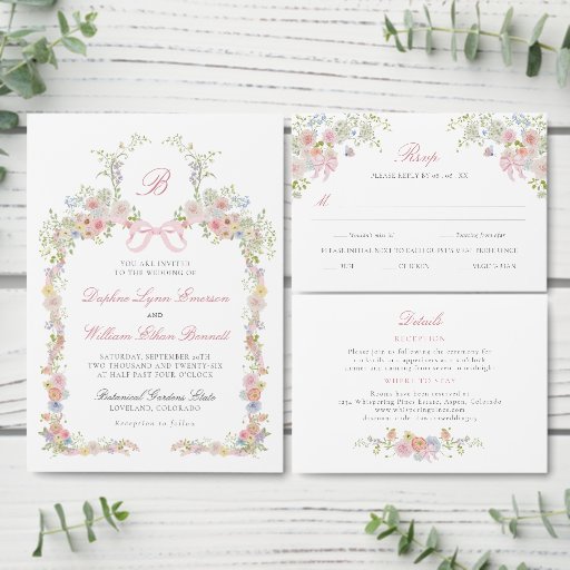 This monogrammed wedding invitation features soft watercolor wildflowers arranged in a graceful Victorian-inspired frame, accented with a delicate blush pink bow and refined botanical details. The romantic front design is paired with a coordinating floral pattern on the back, creating a cohesive and timeless look. Inspired by an English garden, the overall aesthetic feels elegant, airy, and classically romantic.