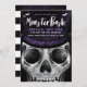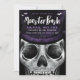 Diseño de la invitación a la fiesta de Halloween con temática de Skeleton. El diseño presenta nuestro propio ilustracion hecho a mano de una vista de cerca de un monstruo de Skeleton con un sombrerete morado oscuro. "Monster Bash" se muestra en un elegante guión de un cepillo escrito a mano en blanco con los detalles de la fiesta de Halloween mostrados sobre el esqueleto artístico para crear un diseño de invitación de fiesta de Halloween audaz y único. El reverso presenta un diseño rústico de rayas negras y violetas. Todos los ilustraciones contenidos en esta audaz invitación temática de Skeleton Halloween son obras de arte originales hechas a mano por Moodthology.