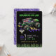 Este diseño inspirado en Monster Jam de alta energía presenta el icónico camión monstruo Grave Digger corriendo a través de un fondo negro atrevido con llamas verdes neón, acentos púrpura y un patrón dinámico de bandera de cuadros. La ilustración del camión potente está en el centro, creando una apariencia llena de acción que se siente rápida, fuerte y emocionante. Las letras verdes brillantes y los detalles púrpura vívidos se suman al tema lleno de adrenalina, lo que hace que este diseño sea perfecto para niños que aman los camiones monstruo y las carreras emocionantes. Los detalles personalizados del evento, como el nombre, la edad, la fecha, la hora y la ubicación, se muestran claramente, lo que hace que el diseño sea divertido y funcional para una celebración de cumpleaños memorable con tema de camiones monstruo.