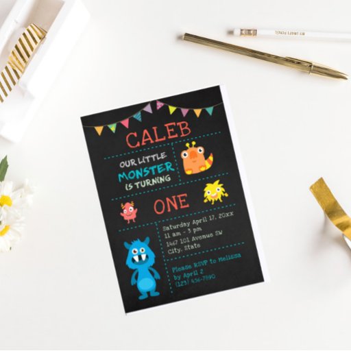 Invitación de un tema monstruo de primer cumpleaños en un fondo de pizarra. También puede cambiar el número de edad. ¡Esto no es solo por los primeros cumpleaños!