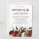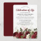 Una invitación al funeral de la 'Celebración de la Vida', diseñada con un fondo blanco clásico, un surtido de flores de color burdeos y blanco con color de agua verde y otros follajes botánicos y una elegante plantilla de invitación conmemorativa que se puede personalizar fácilmente.