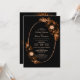 Una elegante invitación a la boda negra con un arreglo floral rústico naranja quemado en un marco ovalado. En esta invitación se han incluido los detalles de la ceremonia y de la dirección de la recepción.