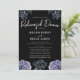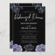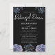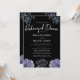 A bold and sophisticated Rehearsal Dinner Invitation featuring dramatic dusty blue and grey floral illustrations against a stark black background. The crisp white typography and classic layout set an elegant, moody tone. Perfect for a formal evening or a sophisticated wedding.