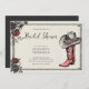 Una elegante plantilla de invitación a la ducha de novias que combina dos temas: el occidental, el de la cowgirl y el gótico, el oscuro y el tema de la moody. Perfecto para novias que aman a los rosas negros, rosas rojas, el tema oscuro y melódico, el tema del gótico, el tema de la ducha nupcial de Halloween y las celebraciones no convencionales. Presenta una caligrafía de escritura moderna y elegante, con un toque dinámico y un marco de gótico romántico. Un diseño para la vaquera morena.
