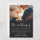 Hermosa y elegante invitación floral a la boda. Esta elegante invitación es una forma de moda de dar a conocer a los invitados su próxima ceremonia matrimonial. Bonito "el boda de" guión de caligrafía se sienta en un oscuro fondo negro dramático con la foto de la pareja, y un dramático patrón de flores botánicas cubre la parte posterior de la tarjeta.