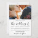 Hermosa y elegante invitación floral a la boda. Esta elegante invitación es una forma de moda de dar a conocer a los invitados su próxima ceremonia matrimonial. Bonito "el boda de" guión de caligrafía se sienta en un oscuro fondo negro dramático con la foto de la pareja, y un dramático patrón de flores botánicas cubre la parte posterior de la tarjeta.