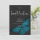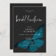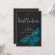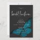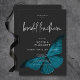 El diseño de la invitación al almuerzo de la ducha de bodas presenta un tema oscuro y amoroso que es sencillo pero impresionante. Un fondo negro de carbón negro oscuro es el lienzo perfecto para una única polilla azul verde azulada, con sus alas para volar. Único y elegante, este diseño se puede utilizar en cualquier temporada. Creado por Simply Farmhouse Press.