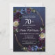 Sofisticados y monótonos rosas morados oscuros y flores silvestres crean un diseño floral de moda. Las copas de blanco y azul añaden un interés visual y una profundidad. Las bayas y la fruta se suman al diseño de la verdura. Juntos, decoran un elegante marco dorado ovalado de varias cadenas. La invitación tiene un sutil patrón geométrico de cosecha. Esta invitación de cumpleaños número 70 es parte de la colección Moody Purple Floral. Contiene plantillas que se pueden utilizar para crear un conjunto de invitaciones único, así como plantillas para señales de bienvenida, suministros de fiestas y decoraciones.