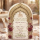 Celebrate your union with elegance featuring a traditional Islamic archway, deep burgundy roses, and the Bismillah in ornate calligraphy for a timeless Nikkah.This design features a sophisticated central layout dominated by a visually textured multifoil archway inspired by Moorish architecture, rendered in a faux carved beige stone effect. At the apex sits the Bismillah in formal Arabic calligraphy, framed by intricate geometric detailing. The structure is softened by clusters of vintage-style watercolor roses in deep burgundy and dark red, accented with muted brown and sage greenery. The typography hierarchy utilizes a classic serif font in dark charcoal against a warm cream background, creating a formal and legible aesthetic.
