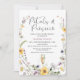 Flores salvajes amarillas púrpura amarillas Petals Prosecco Bridal Shower Invitation Pétalos modernos y la invitación a la ducha de novia prosecco con un cordón de flores silvestres, vidrio de champán y encabezado moderno de caligrafía.