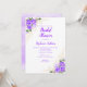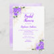 Este elegante diseño floral es perfecto para invitaciones modernas a las duchas de novias. El texto está enmarcado con ramos de rosas de color morado y acentos dorados florales en dos esquinas opuestas.