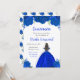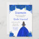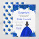 Esta invitación de Quinceanera incluye flores florales azules de la realeza falsas y una hermosa princesa con cabello castaño y un vestido elegante. Es perfecto para una fiesta de cumpleaños de Quinceanera.