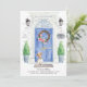 Anuncie su nueva dirección con nuestra elegante invitación con un Jack Russell, una puerta delantera azul, estera de bienvenida, letrero de pizarra, topiarios y una corona floral sobre un fondo de ladrillo gris.