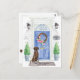 Anuncie su nueva dirección con nuestra elegante invitación que incluye un recuperador de Brown Labrador, puerta delantera azul, alfombra de bienvenida, letrero de pizarra, topiarios y una corona floral sobre un fondo de ladrillo gris.