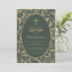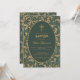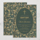 Esta elegante invitación de bautizo con aire vintage, recomendada para el bautizo de un niño, tiene un marco dorado vintage con hojas de cardo doradas en espiral y algunas decoraciones de flores de cardo sobre un fondo verde oscuro. El texto está dentro de un óvalo con borde dorado y tiene una cruz dorada encima. El nombre del niño está escrito en una elegante letra caligráfica. Todo el texto se puede personalizar y tiene un color dorado similar a las decoraciones doradas del marco.