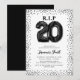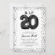 Llora el final de tus 20 con nuestras invitaciones únicas para cumpleaños de adultos. Con un fondo blanco y afilado que presenta globos de helio negros que deletrean 'RIP a mis veinte', esta invitación agrega un toque divertido a los cumpleaños importantes. Acentuada con bordes de purpurina negra y una plantilla de texto de cumpleaños fácil de usar, puedes personalizar fácilmente esta invitación para reflejar tu propio estilo y planes de celebración.