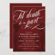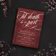 Elegante Halloween burdeos o invitación a una boda de gótico con Muerte de la Piel, ¿nos dedicamos a escribir en un guión de caligrafía blanca y rápída? Añade tu texto de invitación en blanco contra un fondo rojo oscuro con esqueletos más oscuros.