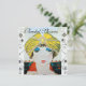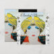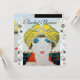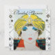 Vibrante, elegante ilustración de alta costura Art Deco francés estilizado con remolinos geométricos, círculos. Retrato de una hermosa y elegante joven que lleva un sombrero oriental amarillo con plumas en colores negro, blanco, amarillo, azul y rojo. Invitación de fiesta fresca, moderna y artística.
