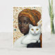 Un impresionante retrato de una joven negra con un cabecero estampado sosteniendo un gato blanco impactante contra un fondo floral.