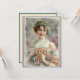 Este hermoso diseño presenta a una mujer victoriana sosteniendo varias rosas rosas rosas y sus hojas y tallos ligeramente en sus brazos. El fondo es un estilo abstracto de acuarela variada.