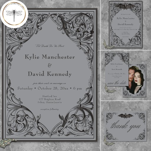 ESTA INVITACIÓN ESTÁ EN DOS LADOS, CON RECEPCIÓN DE BODA E INFORMACIÓN DE REVELO EN LA PARTE TRASERA. EN LA COLECCIÓN TAMBIÉN SE OFRECE UNA INVITACIÓN TRADICIONAL DE UN LADO. Elevar a tu boda gótico con una invitación matrimonial de inspiración victoriana que exuda elegancia y misterio intemporal. Diseñado para parecerse a un enlace de libros antiguo, este impresionante diseño presenta un diseño intrincado de color negro y gris lacado, que evoca el encanto de una época pasada. Un murciélago, con sus alas extendidas, se sienta en el pináculo. El texto, "Parte de la muerte dura", puede ser editado y modificado, o suprimido por completo, si lo prefiere. Que tu historia de amor se desarrolle con una invitación tan inolvidable como tu día. Creado por Simply Farmhouse Press.