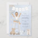 La invitación a la fiesta de primer cumpleaños de las acuarelas azules y doradas incluye a un adorable niño en una trona y adornado con un globo floral, regalos, oso de peluche y tren de juguete. Existen múltiples opciones disponibles para el color del pelo del bebé y el tono de la piel. Divertido primer cumpleaños rompe el pastel con el número uno. También se puede usar para el segundo cumpleaños cambiando texto.