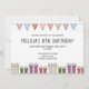El original ilustracion personalizado de Destei de un lindo perro de raza Pug color abrigo negro. El perro está situado en un colorido entorno de cumpleaños, con globos de cumpleaños de color pastel, regalos y una pancarta. Los colores pastel son rosa, verde, azul, rojo, naranja y violeta. El perro está parado en una textura de parqué amarillo y el fondo tiene un juego de puntos polka de color pastel. Personalice las áreas de texto de ejemplo con los detalles de su evento.