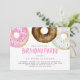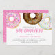 Invite a los invitados a su evento con esta invitación de cumpleaños de personalizable. Cuenta con donuts color agua rosa, chocolate y chocolate blanco con salpicaduras de colores. Personalice agregando sus detalles. Esta invitación de fiesta de cumpleaños no es perfecta para cualquier tema de evento o temporada. Hay otros colores disponibles.