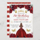 Elegante acuarela princesa de cabello rojo en el diseño de vestidos de rojo profundo con flores rojas y doradas, mariposas y confeti purpurina dorado.