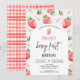 Invitación de primer cumpleaños de fresa de fresa de color rosado rojo Invitación de primer cumpleaños de fresa dulce invitación de primer cumpleaños para una niña que presenta un patrón de fresa, margarita y follaje y un arco blanco. Esta invitación para el primer cumpleaños de berry también presenta un patrón de gingham en la parte trasera y es ideal para una fiesta de primer cumpleaños con temática de berry.