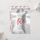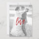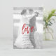 Cree la invitación perfecta para una boda casual, o una celebración de recepción después de una fuga, con este diseño moderno y trendy de tipografía roja, que presenta tipografía de letra a mano sobre una capa de falso papel vitela, y su foto favorita con un filtro en blanco y negro aplicado. La parte trasera de la invitación presenta un muro de grafitis de amor rojo. Contacte al diseñador para obtener productos coincidentes. NOTA DEL CREADOR: La "superposición de vitela" en este producto es un efecto digital. Copyright Anastasia Surridge para Anastasia Designs, todos los derechos reservados.