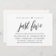 Anuncia tu felicidad eterna con estilo con nuestra tarjeta de invitación para el brunch después de la boda (Nada elegante, solo amor) con diseño de letra moderna (tema negro y blanco). Nuestra tarjeta de invitación para la celebración del brunch de Felicidad Eterna es ideal para parejas que han decidido fugarse y quieren organizar una fiesta para celebrar su unión. Con su diseño sofisticado pero juguetón, esta invitación seguramente establecerá el tono para un evento inolvidable. La tarjeta de invitación presenta un diseño minimalista, agregando un toque de elegancia atemporal a tu celebración. Diseñado por TeeshaDerrick