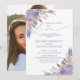 Crea la invitación perfecta para una boda casual, o celebración de recepción después de una fuga, con este diseño moderno y trendy de flores de acuarela en color lavanda lila, tipografía de letra manuscrita. El diseño presenta tu foto favorita en la parte trasera de la tarjeta. Contacta al diseñador para obtener productos a juego. ¡Muchas gracias por apoyar nuestro pequeño negocio, lo apreciamos mucho!