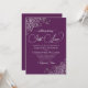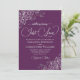 Esta hermosa invitación a la boda es sencilla, moderna, elegante y divertida. Cuenta con un hermoso diseño de ciruela morada y plata con rizos de Relieve metalizado falsos de encaje y remolinos en las esquinas, y escritura moderna con letras que explican: Nothing Fancy, Just Love. Romántica, elegante y glam, aunque alegre y alegre, esta invitación a la boda es perfecta para una ceremonia informal o formal.