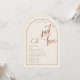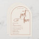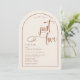 Una elegante y moderna y terrenal invitación a una boda en forma de arco que incluye texto minimalista con acento de escritura a mano en la frase "nada elegante solamente amor". Se muestra en un fondo de color crema con texto de terracota y elementos de diseño, pero todos los elementos se pueden colorear para que coincidan con el tema. © Kimbellished, LLC