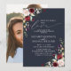 Crea la invitación perfecta para una boda casual, o celebración de recepción después de una fuga, con este diseño moderno y trendy, con flores de acuarela en rojo burgundy y blush, con tipografía de letra manuscrita, sobre un fondo azul marino. El diseño incluye tu foto favorita en la parte trasera de la tarjeta. Contacta al diseñador para obtener productos a juego. ¡Muchas gracias por apoyar nuestro pequeño negocio, lo apreciamos mucho!