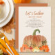 Invitación a la cena de Acción de Gracias para amigos y/o familia. Calabaza naranja y caída purpurinoso de oro con texto, "Reunámonos y demos las gracias". Añade la información de su cena y ubicación a esta hermosa tarjeta.
