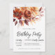 Las elegantes flores de color naranja de terracota crean un audaz arreglo floral en la parte superior de esta invitación de cumpleaños. Un sencillo guión le da un aire moderno.