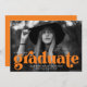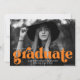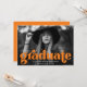 Audaces invitaciones a fiestas de graduación con la foto horizontal del graduado con "graduado" en negrita con letras naranjas. Personalice las invitaciones de la fiesta de graduación con fotos agregando el nombre del graduado, el año de graduación y la escuela. La fiesta de graduación del naranja invita a revertir para mostrar los detalles de su fiesta.