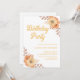 Una elegante y elegante invitación de cumpleaños con una flor naranja y un arreglo de hojas marrones con tipografía moderna de oro sobre un fondo blanco.